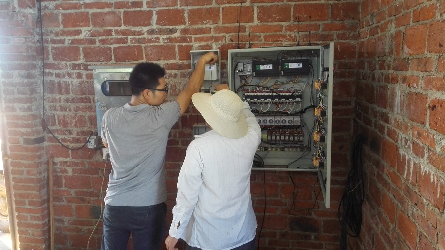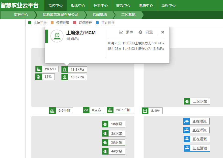 傳感器、控制系統(tǒng)與云平臺(tái)實(shí)現(xiàn)一體聯(lián)動(dòng),觸發(fā)設(shè)定條件,如當(dāng)土壤濕度低于設(shè)定數(shù)值,系統(tǒng)則自動(dòng)打開灌溉設(shè)備。通過云平臺(tái),工作人員在手機(jī)或者電腦上就可以遠(yuǎn)程控制灌溉設(shè)備。此外,綠源果菜在現(xiàn)在安裝了一體控制系統(tǒng),工作人員在現(xiàn)場通過控制箱即可對(duì)所有設(shè)備進(jìn)行集中控制。