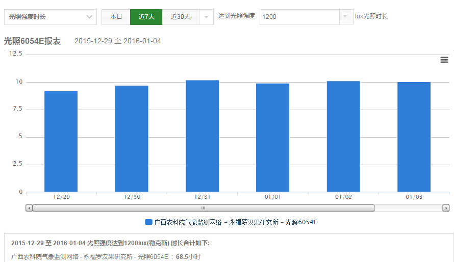 利用空氣溫度傳感器、空氣濕度傳感器、光照度、降雨量等傳感設(shè)備實時監(jiān)測羅漢果種植的氣象環(huán)境。實時監(jiān)測的環(huán)境情況數(shù)據(jù)每隔10秒鐘就上傳到“天潤智力智慧農(nóng)業(yè)云平臺”,羅漢果研究人員只要登錄手機APP或者在電腦上,就可以遠(yuǎn)程隨時隨地查看羅漢果種植園區(qū)的各項關(guān)鍵數(shù)據(jù)。所采集的數(shù)據(jù)實時上傳到天潤智力智慧農(nóng)業(yè)云平臺,并快速進(jìn)行統(tǒng)計分析,解決了科研人員對數(shù)據(jù)的采集分析需求,并確保了數(shù)據(jù)采集的精準(zhǔn)、快速。且在云平臺報表中心,研究人員可以隨時調(diào)取任何時間的數(shù)據(jù)進(jìn)行對比分析,更全面直觀地了解到氣象數(shù)據(jù)的變化與羅漢果生長情況的關(guān)系。