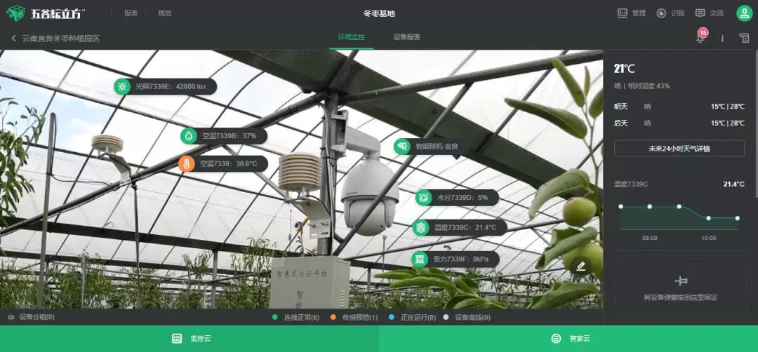 為了保障技術(shù)員的農(nóng)事操作標(biāo)準(zhǔn)化,高度把控冬棗生長環(huán)境,天潤智力農(nóng)技服務(wù)團隊在大棚內(nèi)安裝全方位的物聯(lián)網(wǎng)監(jiān)控設(shè)備,對棚內(nèi)的空氣溫濕度、光照度、大氣壓力,土壤張力、土壤溫濕度進行24小時不間斷監(jiān)控,維持大棚內(nèi)環(huán)境的平衡穩(wěn)定。另外當(dāng)某個數(shù)據(jù)超過或低于預(yù)設(shè)的闕值,系統(tǒng)會自動預(yù)警,提醒工作人員采取相應(yīng)措施,避免意外發(fā)生。