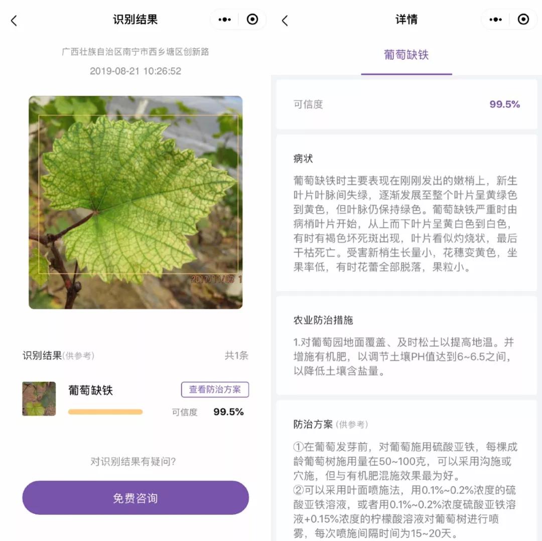 此外,葡萄園員工利用天潤(rùn)智力人工智能應(yīng)用——耘眼(微信小程序/APP),只需要用手機(jī)拍攝葡萄的葉片、果實(shí)照片,就能進(jìn)行病蟲(chóng)害識(shí)別,從而獲得對(duì)應(yīng)的防治措施和用藥方案。目前,耘眼基于上萬(wàn)張樣本量,能夠識(shí)別幾十種陽(yáng)光玫瑰葡萄常見(jiàn)病蟲(chóng)害,識(shí)別準(zhǔn)確率達(dá)98%以上。