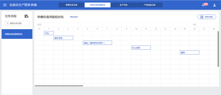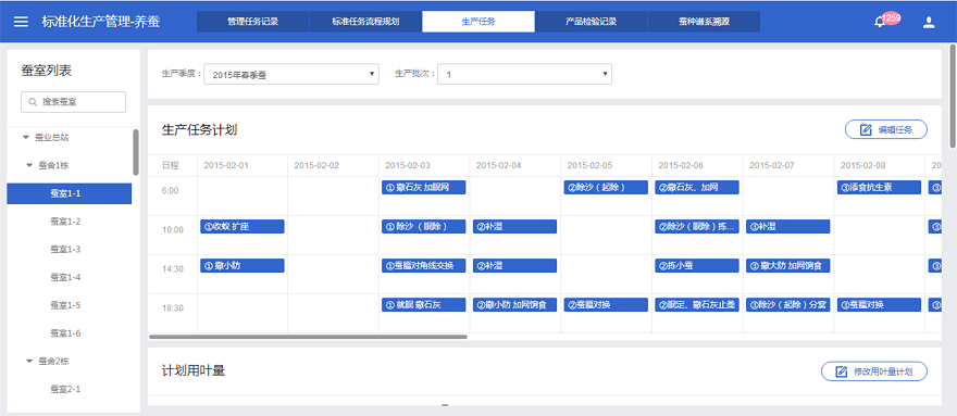 桑蠶養(yǎng)殖周期短,各生理階段生長(zhǎng)變化快,工藝流程復(fù)雜繁多,且鑒于蠶業(yè)總站蠶種繁育數(shù)量多,每批蠶種的繁育階段有一定差異,這意味著工作人員必須熟記每個(gè)蠶室的生產(chǎn)進(jìn)度,并嚴(yán)格做好工作記錄,一旦工作有所疏忽,則會(huì)造成繁育生產(chǎn)進(jìn)度紊亂,嚴(yán)重則會(huì)對(duì)整體運(yùn)營(yíng)管理包括桑園種植、噴藥、采摘,以及其他蠶室生產(chǎn)造成一系列聯(lián)動(dòng)影響。智能桑蠶種養(yǎng)物聯(lián)網(wǎng)系統(tǒng)平臺(tái)根據(jù)蠶種繁育的生產(chǎn)需求,制定了規(guī)范標(biāo)準(zhǔn)化的蠶種生產(chǎn)流程,這一標(biāo)準(zhǔn)化生產(chǎn)流程具體到全生產(chǎn)周期,每一個(gè)繁育階段,每天、每小時(shí)的蠶種繁育生產(chǎn)任務(wù),如投食、消毒等。每個(gè)蠶室在開展本周期蠶種繁育生產(chǎn)時(shí),可在平臺(tái)上啟動(dòng)相應(yīng)蠶室的標(biāo)準(zhǔn)化生產(chǎn)流程,一旦流程啟動(dòng),工作人員手機(jī)則會(huì)收到平臺(tái)自動(dòng)發(fā)送的生產(chǎn)任務(wù),進(jìn)而根據(jù)提示完成任務(wù)并在平臺(tái)上完成任務(wù)匯報(bào)。如有特殊情況導(dǎo)致生產(chǎn)進(jìn)度發(fā)生變化,工作人員可以根據(jù)實(shí)際情況在平臺(tái)上進(jìn)行自動(dòng)調(diào)整,繼而根據(jù)標(biāo)準(zhǔn)化生產(chǎn)流程開展蠶種繁育。與此同時(shí),管理人員能夠?qū)崿F(xiàn)對(duì)整個(gè)蠶廠的整體生產(chǎn)運(yùn)營(yíng)進(jìn)行全程跟蹤和追溯,快速發(fā)現(xiàn)問題以及將責(zé)任落到明確的工作人員身上,不僅實(shí)現(xiàn)對(duì)蠶種養(yǎng)殖的管理,也實(shí)現(xiàn)了對(duì)人員的有效管理。