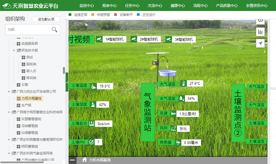大的生態(tài)環(huán)境短期內(nèi)無(wú)法改變,若是想讓水稻達(dá)到自然有機(jī)的種植的標(biāo)準(zhǔn),必須通過(guò)水稻田間種植管理,改變局部種植環(huán)境來(lái)實(shí)現(xiàn)。2015年5月,廣西力拓農(nóng)業(yè)開(kāi)發(fā)有限公司引進(jìn)天潤(rùn)智力智慧農(nóng)業(yè)監(jiān)控系統(tǒng)及農(nóng)產(chǎn)品溯源系統(tǒng),實(shí)現(xiàn)對(duì)水稻田進(jìn)行溫度、濕度、土壤PH值等環(huán)境數(shù)據(jù)的實(shí)時(shí)監(jiān)測(cè),以便在最合適的時(shí)機(jī)對(duì)稻田做最優(yōu)的管理方式,全程記錄水稻生長(zhǎng)過(guò)程,實(shí)現(xiàn)水稻生產(chǎn)的全程可溯源。