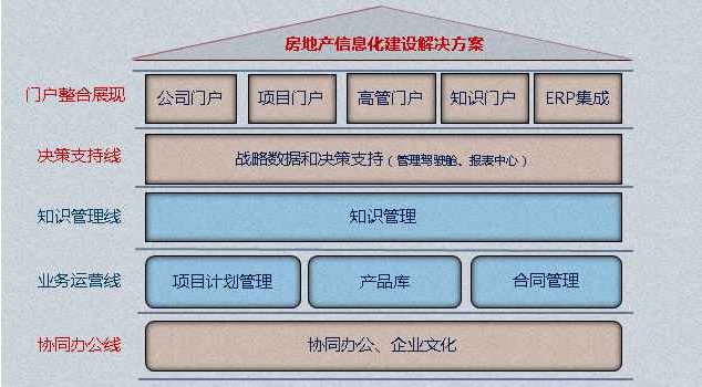 天潤智力十余年積淀“知識管理”和“流程管理”的精深技能,在房地產(chǎn)行業(yè)注重管理、業(yè)務(wù)能力雙線提升,為房地產(chǎn)提供協(xié)同辦公、業(yè)務(wù)運營、知識管理、決策 支持、門戶整合等五個層次的一體化解決方案藍圖。統(tǒng)一規(guī)劃,分步實施,支撐企業(yè)不同階段的業(yè)務(wù)和管理需求。天潤智力地產(chǎn)行業(yè)信息化解決方案藍圖如下: