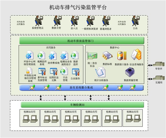 系統(tǒng)不僅監(jiān)管新車、在用車標(biāo)志使用情況,監(jiān)測在用車檢測情況和檢測設(shè)備的工況情況,而且通過和路檢、臨檢和遙感測量的檢測信息比對,對在用車及檢測場進行及時監(jiān)管。