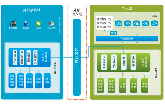 針對電商、合作伙伴、銀行、微信等外部網(wǎng)絡接入需求,零售信息整合平臺提供基于ESB的統(tǒng)一接入方式,實現(xiàn)外部網(wǎng)絡域集團內(nèi)部網(wǎng)絡隔離,最大程度的保障集團內(nèi)部系統(tǒng)安全。