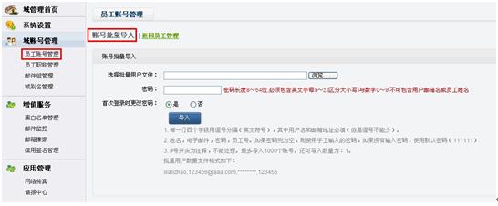 1.創(chuàng)建賬號:請點(diǎn)擊“員工賬號管理”,將賬號批量導(dǎo)入,創(chuàng)建郵箱賬號,如下圖: