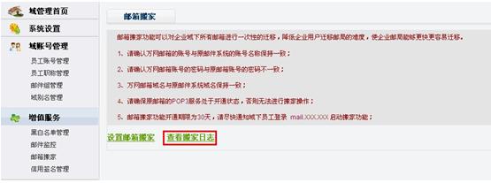 5.查看搬家狀態(tài) • 點(diǎn)擊上圖標(biāo)紅框的“查看搬家日志”按鈕即可進(jìn)入下圖日志列表頁面。 圖1-5 • 查看狀態(tài)共有五種: 完成:從觸發(fā)開始搬家搬完老郵箱的最后一封郵件。 未開始:尚未登錄或者使用客戶端搬家的賬號。 搬家中:已經(jīng)登錄或者使用客戶端收發(fā)信的但是尚未搬完的賬號。 失。河捎诶相]箱服務(wù)器暫停,或者網(wǎng)路情況引起的導(dǎo)致搬家沒有觸發(fā)。 非搬家賬號:首次登錄通過檢查發(fā)現(xiàn)老服務(wù)器上沒有此賬號的都?xì)w于非搬家賬號。 • 開始時(shí)間中您可能會發(fā)現(xiàn):POP觸發(fā)搬家,此類標(biāo)記表明當(dāng)前賬號使用的是客戶端觸發(fā)的搬家。 • 未搬家郵件數(shù):指的是原郵箱上還剩多少郵件沒有搬家。 • 已搬家郵件數(shù):指的是已經(jīng)從原郵箱上搬過來的郵件數(shù)量。 • 郵件總數(shù):未搬家以及已搬家郵件數(shù)。 6.員工賬號頁面 • 如果搬家的賬號沒有使用老郵箱密碼登錄,而使用了新密碼登錄,則此時(shí)客戶可以在郵箱首頁觸發(fā)搬家; • 此處需要留意:如果啟動了搬家,則系統(tǒng)會使用老郵箱密碼覆蓋新郵箱密碼; • 如果員工賬號輸入的密碼不正確,會在頁面頂端提示客戶:未開始搬家,請您與管理員核實(shí)賬號和密碼; • 搬家成功后,首頁刷新后會變?yōu)椴樵儼粹o; • 客戶點(diǎn)擊查詢按鈕可以查詢當(dāng)前搬家狀態(tài),日志會顯示未搬家郵件數(shù)和已搬家郵件數(shù); • 此處需要留意:如果啟動了搬家,則系統(tǒng)會使用老郵箱密碼覆蓋新郵箱密碼; • 此區(qū)域在30天有效期后,或管理員關(guān)閉搬家功能后消失; 8.其他注意事項(xiàng): • 有效期30天內(nèi),每次登錄郵箱后均觸發(fā)搬家; • 搬家日志是動態(tài)的:例如某個(gè)賬號本次搬家結(jié)束后為成功狀態(tài),在30天有效期內(nèi),下次登錄中由于網(wǎng)絡(luò)問題搬家未完成,則當(dāng)前賬號在postmaster中的日志會變?yōu)椋菏顟B(tài); • 開始時(shí)間:為員工賬號首次觸發(fā)的時(shí)間,此時(shí)間固定不變;其中“POP觸發(fā)搬家”是指那些使用Foxmail和Outlook觸發(fā)搬家動作的客戶,由于服務(wù)器上無法抓取到時(shí)間,因此使用文字提示。