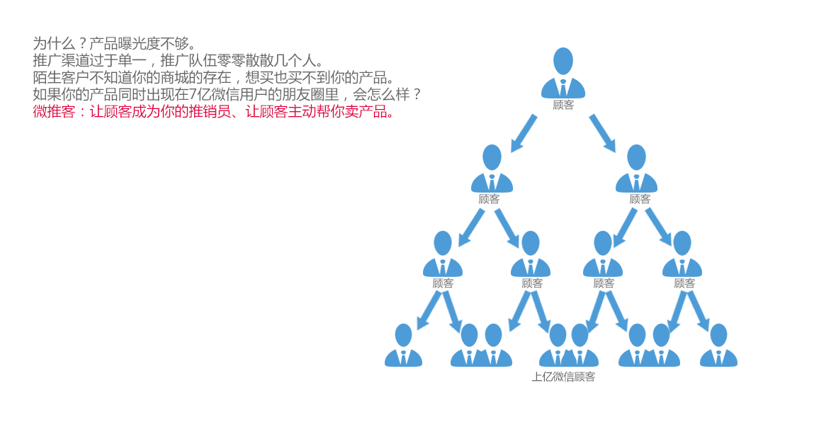 基于買家即賣家的理念,在微信上幫商家分享商城鏈接而賺取傭金的群體,統(tǒng)稱為“微推客”。相當(dāng)于微信商城的商品導(dǎo)購(gòu)員,為商家推薦客戶、推銷產(chǎn)品。 微推客將商城商品頁(yè)面,會(huì)員注冊(cè)頁(yè)面、商城首頁(yè)等鏈接分享到朋友圈、微信群、QQ、微博等,商家按點(diǎn)擊量、會(huì)員注冊(cè)量、購(gòu)買下單量付給微推客一定比例的傭金。