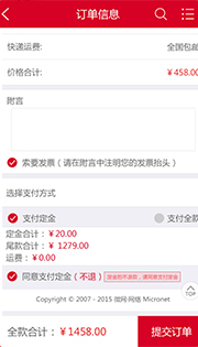 3、支付時可選擇支付定金或者全額支付,后臺還可以設(shè)置付款完成以后訂單處于確認(rèn)狀態(tài)。