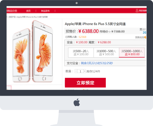 1、商城列表頁展示當(dāng)前正在進(jìn)行預(yù)訂的產(chǎn)品,點擊立即預(yù)訂跳轉(zhuǎn)到詳情頁。
