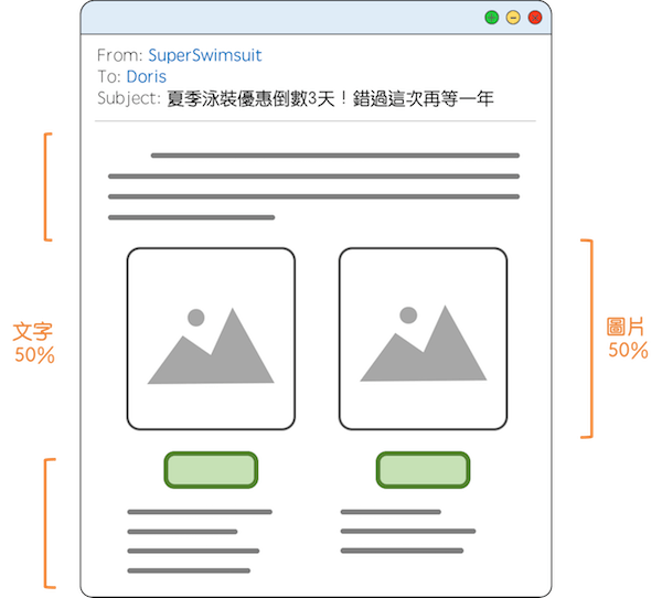 因此,在內(nèi)容上取得圖片與文字的平衡會(huì)是比較好的策略,電子郵件內(nèi)容適合的圖片與文字比例,大約是5:5 到6:4 左右,一方面可以保持圖片設(shè)計(jì)帶給讀者的豐富感受,透過圖像顯示縮短讀者閱讀信件所花的時(shí)間,另一方面當(dāng)在圖片無(wú)法正確顯示的情況下,讓讀者對(duì)于電子郵件內(nèi)容的理解達(dá)到最大。