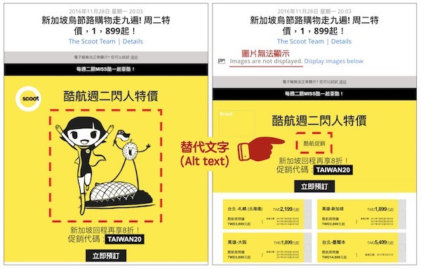 除此之外,替圖片加上替代文字(alt text)是一個(gè)設(shè)計(jì)電子郵件的好習(xí)慣,這種防御型設(shè)計(jì)可以讓電子郵件在圖片尚未顯示或是無(wú)法正確顯示的情況下,仍然維持一定程度的可讀性。