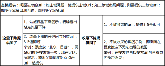 2.站點(diǎn)收錄下降,需要提供單條未被百度收錄的URL,同時(shí)附加未被收錄的截圖,一般而言,URL提供3到5條即可。