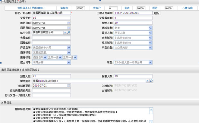 行程制作:制作散團(tuán)行程,細(xì)化到酒店、車(chē)、餐、導(dǎo)游、景點(diǎn)、節(jié)目、購(gòu)物等