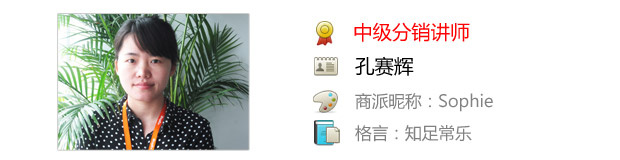 商派中級分銷講師,09年接觸淘寶,11年加入商派分銷團(tuán)隊(duì),以其扎實(shí)、嚴(yán)謹(jǐn)?shù)闹v課風(fēng)范獲得客戶一致好評。2011年半年內(nèi)授課高達(dá)100節(jié),是唯一一個 在短短三個月內(nèi)由預(yù)備講師直接升中級講師的。客戶都稱贊說:“有了Sophie老師,我們做分銷覺得很放心。”