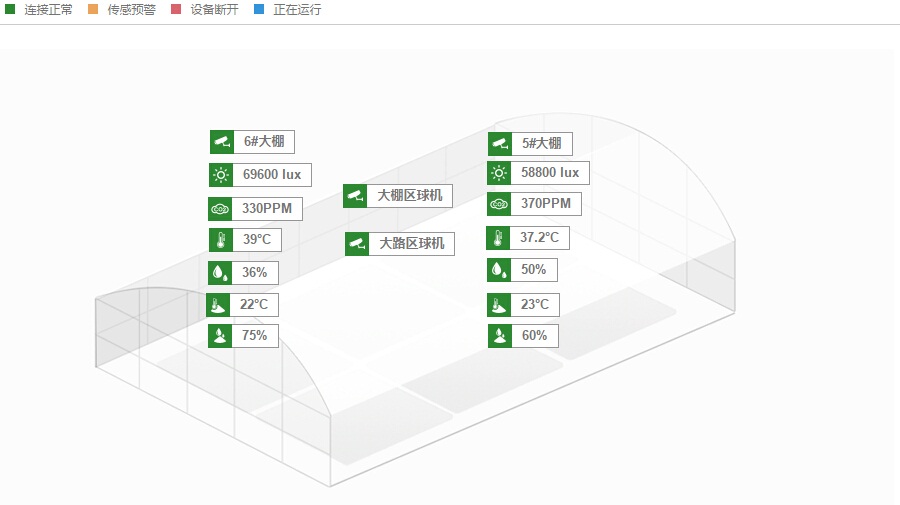 利用土壤溫度傳感器、土壤濕度傳感器、空氣溫度傳感器、空氣濕度傳感器等傳感設(shè)備實時監(jiān)測大棚的環(huán)境,并借助部署在關(guān)鍵監(jiān)控點的高清攝像頭,實時查看大棚作物的長勢。
