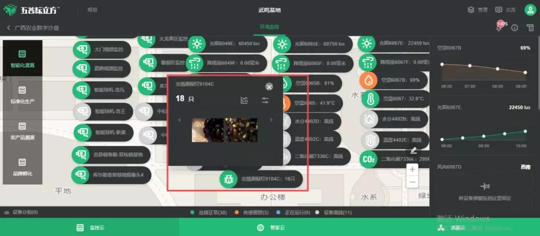 天潤(rùn)智力在試驗(yàn)站內(nèi)安裝了智能蟲(chóng)情測(cè)報(bào)燈,在害蟲(chóng)出沒(méi)高峰期進(jìn)行誘蟲(chóng)捕獲并拍照。通過(guò)系統(tǒng)遠(yuǎn)程查看接蟲(chóng)盒內(nèi)的蟲(chóng)子情況,實(shí)現(xiàn)區(qū)域的病蟲(chóng)害監(jiān)測(cè)和害蟲(chóng)類(lèi)別的自動(dòng)分類(lèi)和計(jì)數(shù),當(dāng)系統(tǒng)監(jiān)測(cè)到接蟲(chóng)盒內(nèi)的蟲(chóng)子數(shù)量超過(guò)預(yù)設(shè)的數(shù)量時(shí),系統(tǒng)會(huì)自動(dòng)預(yù)警,提醒用戶(hù)此時(shí)為蟲(chóng)害高發(fā)期,應(yīng)及時(shí)防治。