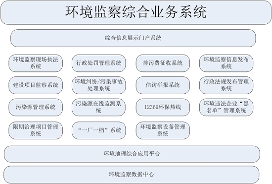 隨著環(huán)境保護信息化建設(shè)的不斷深入,環(huán)境保護業(yè)務(wù)主管部門紛紛建設(shè)了各種業(yè)務(wù)管理系統(tǒng),如污染源管理系統(tǒng)、建設(shè)項目管理系統(tǒng)、排污收費系統(tǒng)等,環(huán)境監(jiān)察人員執(zhí)行環(huán)境監(jiān)察、行政執(zhí)法的日常工作中,將不得不同時面對多個業(yè)務(wù)系統(tǒng),而且各業(yè)務(wù)系統(tǒng)之間不能信息共享和業(yè)務(wù)流程的互動,部分阻礙了環(huán)境監(jiān)察管理的工作發(fā)展。