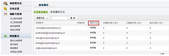 5.查看搬家狀態(tài) • 點(diǎn)擊上圖標(biāo)紅框的“查看搬家日志”按鈕即可進(jìn)入下圖日志列表頁面。 圖1-5 • 查看狀態(tài)共有五種: 完成:從觸發(fā)開始搬家搬完老郵箱的最后一封郵件。 未開始:尚未登錄或者使用客戶端搬家的賬號。 搬家中:已經(jīng)登錄或者使用客戶端收發(fā)信的但是尚未搬完的賬號。 失。河捎诶相]箱服務(wù)器暫停,或者網(wǎng)路情況引起的導(dǎo)致搬家沒有觸發(fā)。 非搬家賬號:首次登錄通過檢查發(fā)現(xiàn)老服務(wù)器上沒有此賬號的都?xì)w于非搬家賬號。 • 開始時(shí)間中您可能會發(fā)現(xiàn):POP觸發(fā)搬家,此類標(biāo)記表明當(dāng)前賬號使用的是客戶端觸發(fā)的搬家。 • 未搬家郵件數(shù):指的是原郵箱上還剩多少郵件沒有搬家。 • 已搬家郵件數(shù):指的是已經(jīng)從原郵箱上搬過來的郵件數(shù)量。 • 郵件總數(shù):未搬家以及已搬家郵件數(shù)。 6.員工賬號頁面 • 如果搬家的賬號沒有使用老郵箱密碼登錄,而使用了新密碼登錄,則此時(shí)客戶可以在郵箱首頁觸發(fā)搬家; • 此處需要留意:如果啟動了搬家,則系統(tǒng)會使用老郵箱密碼覆蓋新郵箱密碼; • 如果員工賬號輸入的密碼不正確,會在頁面頂端提示客戶:未開始搬家,請您與管理員核實(shí)賬號和密碼; • 搬家成功后,首頁刷新后會變?yōu)椴樵儼粹o; • 客戶點(diǎn)擊查詢按鈕可以查詢當(dāng)前搬家狀態(tài),日志會顯示未搬家郵件數(shù)和已搬家郵件數(shù); • 此處需要留意:如果啟動了搬家,則系統(tǒng)會使用老郵箱密碼覆蓋新郵箱密碼; • 此區(qū)域在30天有效期后,或管理員關(guān)閉搬家功能后消失; 8.其他注意事項(xiàng): • 有效期30天內(nèi),每次登錄郵箱后均觸發(fā)搬家; • 搬家日志是動態(tài)的:例如某個(gè)賬號本次搬家結(jié)束后為成功狀態(tài),在30天有效期內(nèi),下次登錄中由于網(wǎng)絡(luò)問題搬家未完成,則當(dāng)前賬號在postmaster中的日志會變?yōu)椋菏顟B(tài); • 開始時(shí)間:為員工賬號首次觸發(fā)的時(shí)間,此時(shí)間固定不變;其中“POP觸發(fā)搬家”是指那些使用Foxmail和Outlook觸發(fā)搬家動作的客戶,由于服務(wù)器上無法抓取到時(shí)間,因此使用文字提示。
