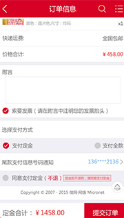 3、支付時可選擇支付定金或者全額支付,后臺還可以設(shè)置付款完成以后訂單處于確認(rèn)狀態(tài)。