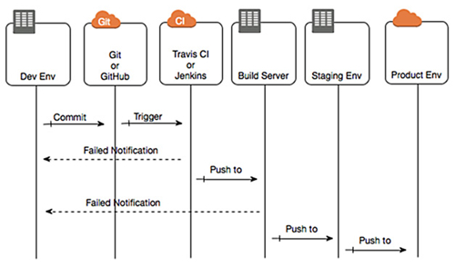 工程在開發(fā)環(huán)境進行簡單的提交前檢查,如靜態(tài)分析和簡單的測試,然后提交到代碼托管服務(wù),通過Code Review后合并入庫,進行完整的自動測試,最后根據(jù)需要發(fā)布到測試或生產(chǎn)環(huán)境。