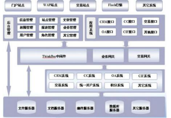 一般來說,證券公司現(xiàn)有的網(wǎng)站系統(tǒng)都包括交易系統(tǒng),CRM系統(tǒng),咨詢數(shù)據(jù)庫(kù),OA辦公等資源進(jìn)入網(wǎng)站,通過ThinkBus中間技術(shù)來實(shí)現(xiàn)這一過程。