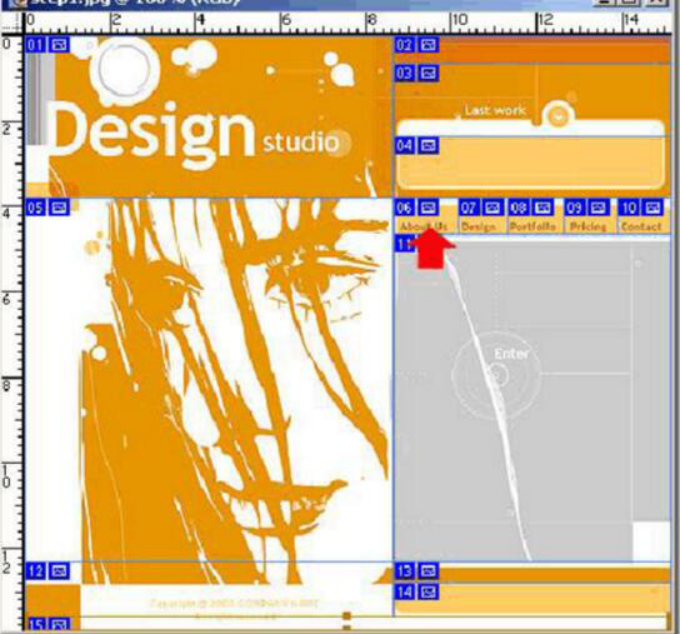 選擇工具板上的slice切片工具,先大刀闊斧的切上一番! 技巧:大面積的色塊單獨(dú)切成一塊,盡可能的保持在水平線上的整齊(這個問題你們在后面的制作頁面中深有感觸)切好的圖如下所示: