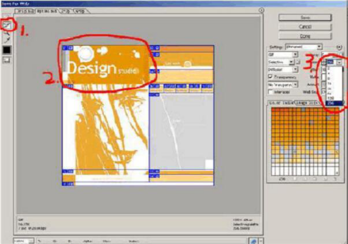 我們來看看紅線所標(biāo)識的1.2.3部分,將1所示的切片工具選中,然后點(diǎn)選2所示的圖片,在3所示的地方選擇色值,如果色彩單一可以選擇盡量小的色值位;設(shè)置好之后輸出文件,文件里包括htm和image的文件夾。到這里頁面就算完成一半。