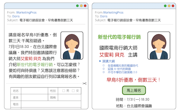 很顯然,右邊的電子郵件更能幫助有興趣的人快速掌握主題,并且讓他們?cè)诶斫庵攸c(diǎn)之后,選擇是否要進(jìn)一步閱讀相關(guān)的詳細(xì)資訊。