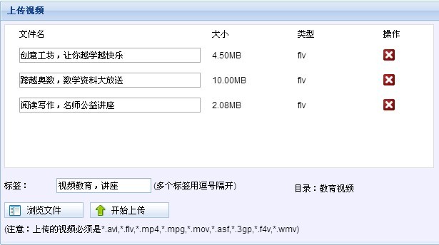 (1)在管理視頻界面中點擊“上傳視頻”,從彈出的對話框中點擊“瀏覽文件”,選擇本地的一個或多個視頻文件并點擊確定,選擇視頻分類,并為視頻填寫標簽,如下圖;