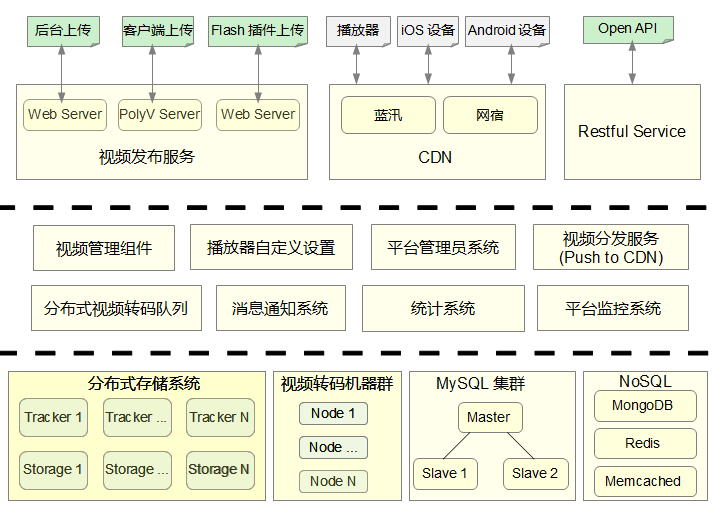 視頻云平臺(tái)是一個(gè)復(fù)雜的分布式軟件系統(tǒng),在技術(shù)選型方面采用目前主流的Java EE平臺(tái)。開(kāi)發(fā)語(yǔ)言主要使用Java和Python,關(guān)系數(shù)據(jù)庫(kù)使用MySQL,NoSQL數(shù)據(jù)庫(kù)使用MongoDB、Redis和Memcached,其中,MongoDB主要用于存儲(chǔ)訪問(wèn)日志,Redis主要用于構(gòu)建具有優(yōu)先級(jí)的分布式隊(duì)列,Memcached用于緩存數(shù)據(jù)。視頻云平臺(tái)的架構(gòu)如圖3所示。