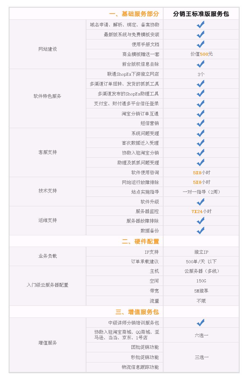 分銷王標(biāo)準(zhǔn)套餐適合初入電子商務(wù),開辟分銷渠道的中小企業(yè)、個人以及創(chuàng)業(yè)團(tuán)隊(duì),為您提供入門級云服務(wù)器和最新版分銷王網(wǎng)上商店系統(tǒng)。